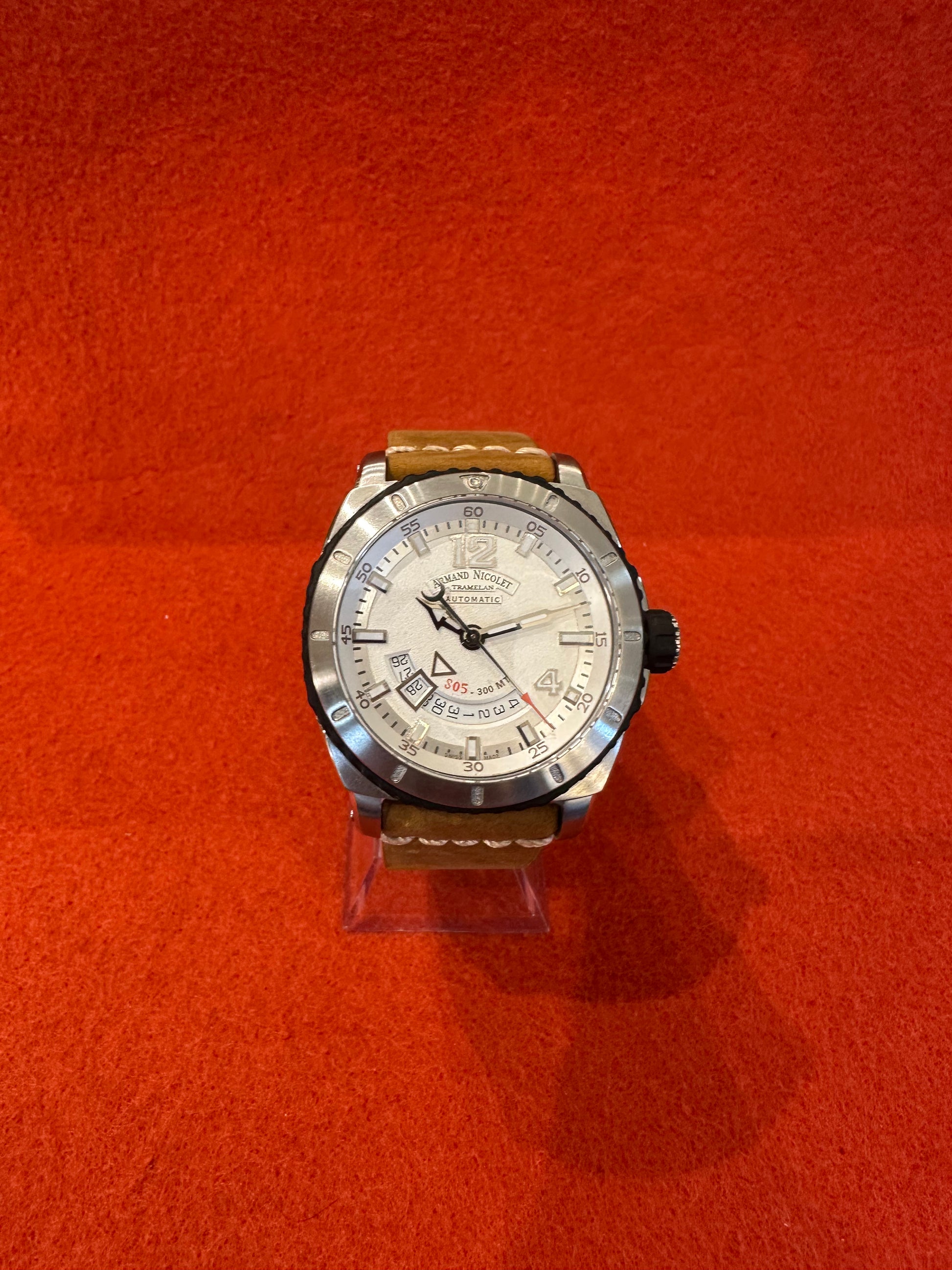 Montre Armant Nicolet S05 automatique de 2017, dotée d’une date à 7h30 grâce à un grand guichet présentant un cadran blanc argenté avec index et aiguilles luminescentes, logé dans un boîtier acier de 46,1 mm de diamètre, 1,43 mm d’épaisseur pour un poids brut de 127,57 g, montée sur un bracelet en cuir huilé marron avec boucle noire. Set complet.
