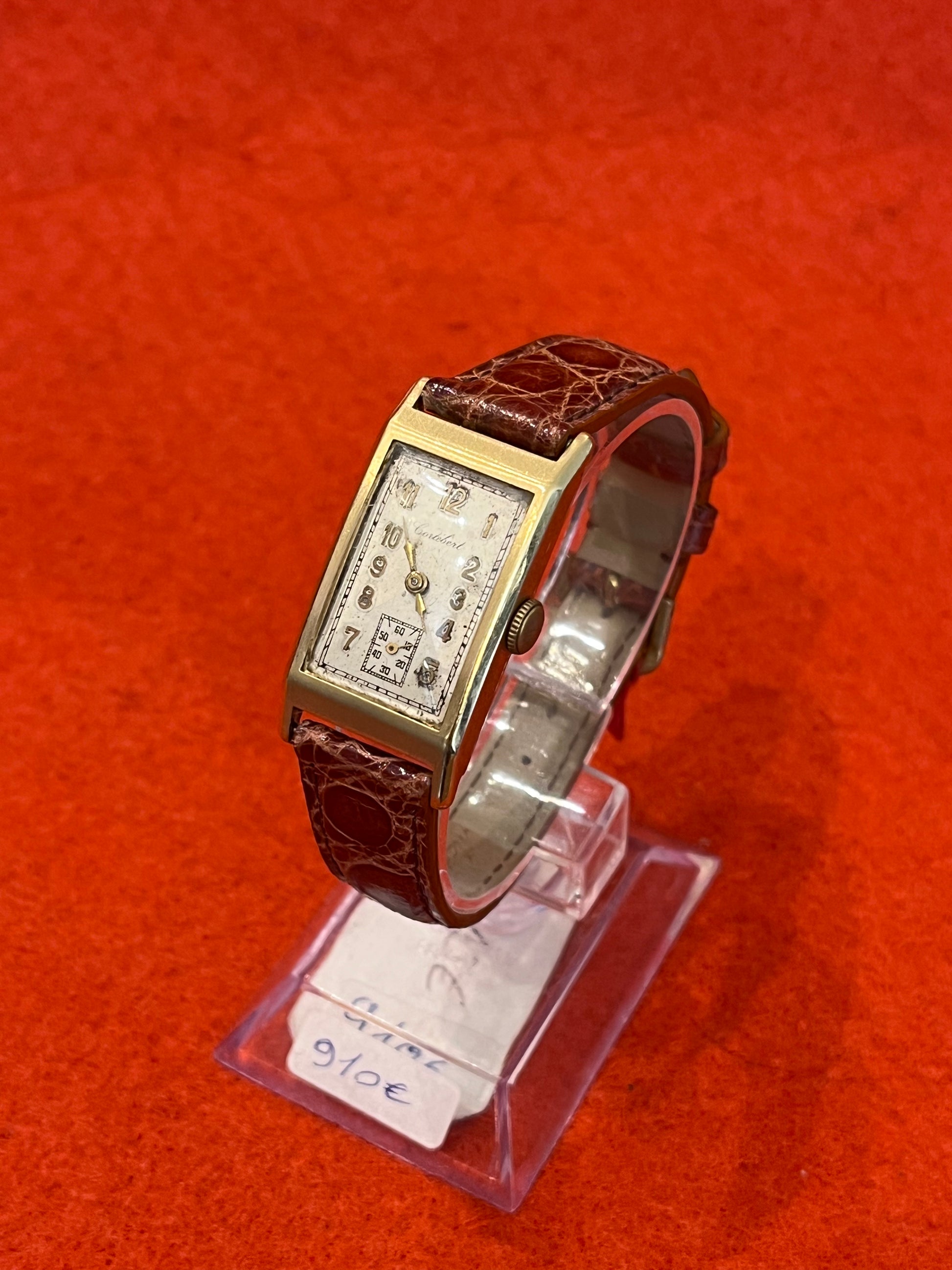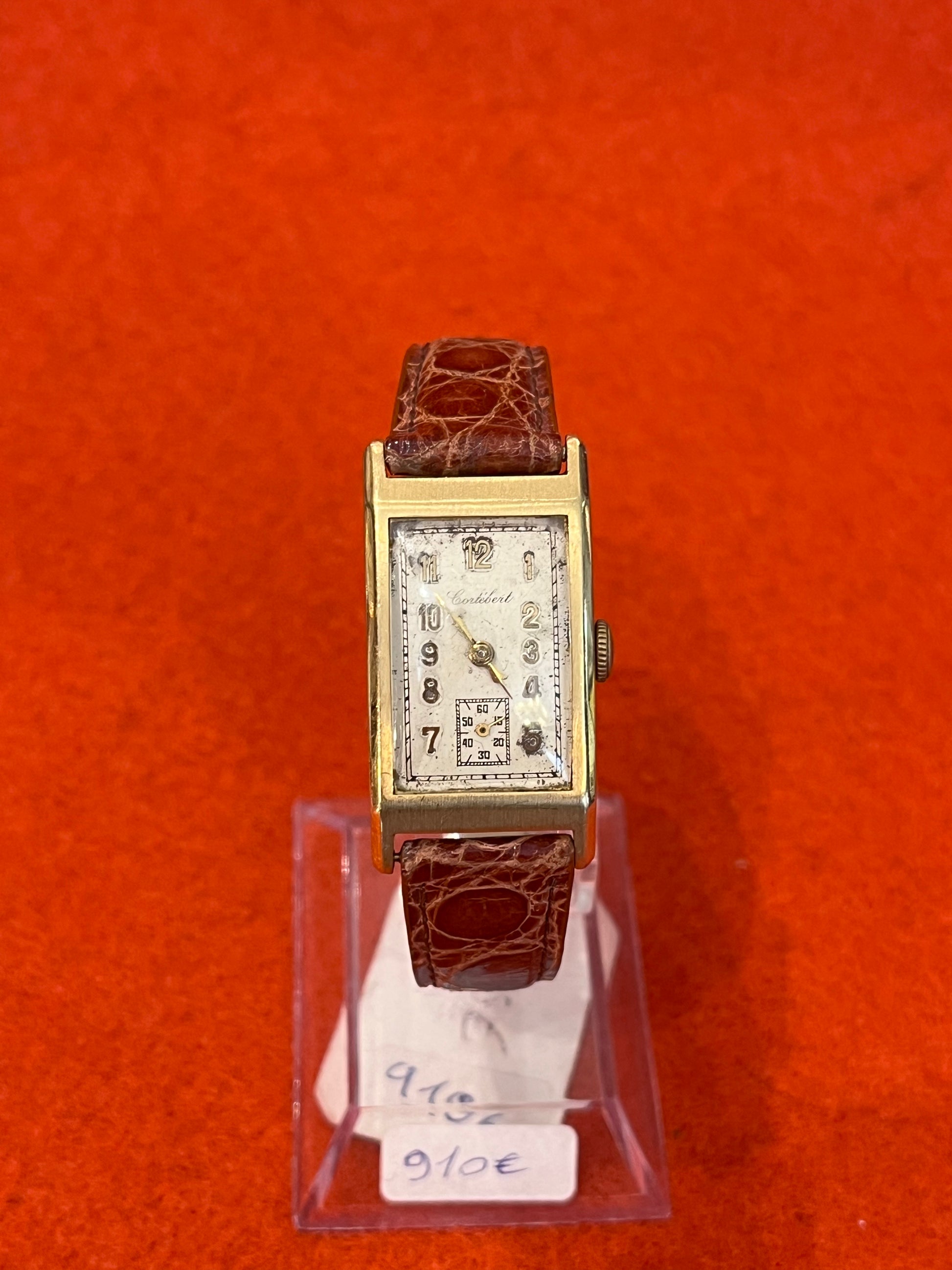 Cortebert de 1937 en or 750/1000, avec seconde a 6 heure, équipée du calibre 634 manufacturer Cortebert, avec un cadran sablier bitexcure , le boitier et de longueur 29.8 mm, largeur 19.2mm épaisseur 7.9 mm, poids brut 20.61 g, montée sur un bracelet en crocodile marron.