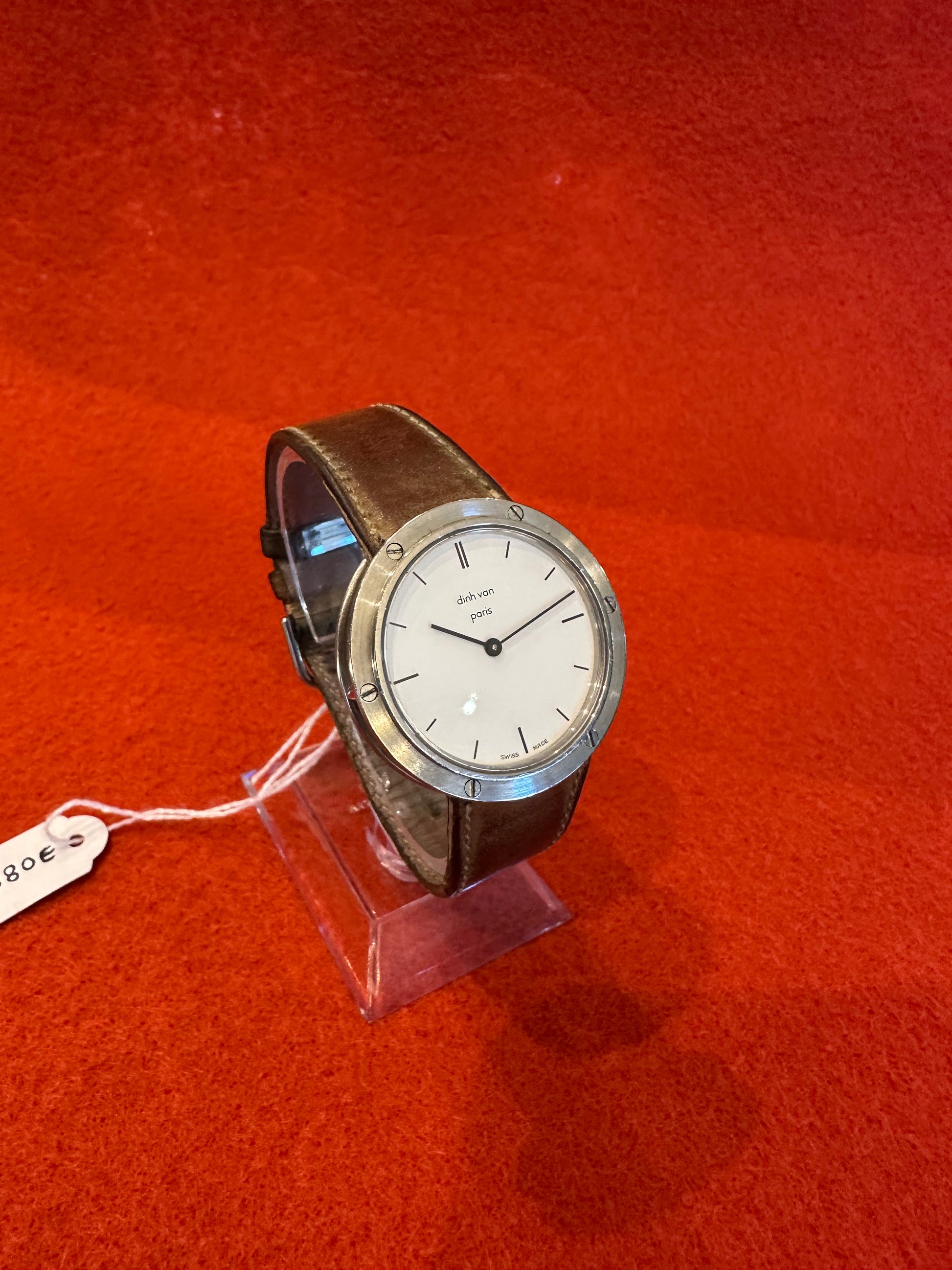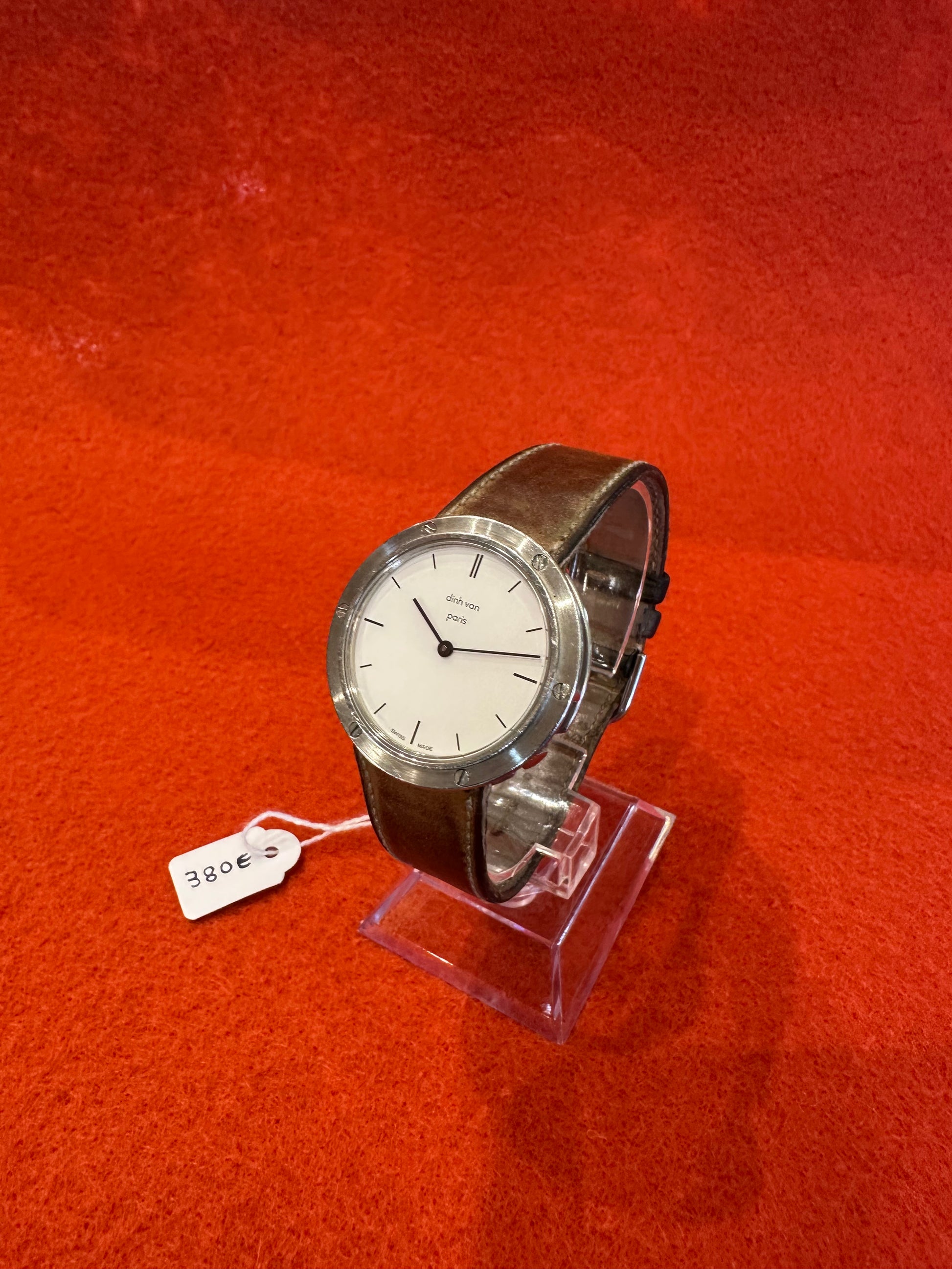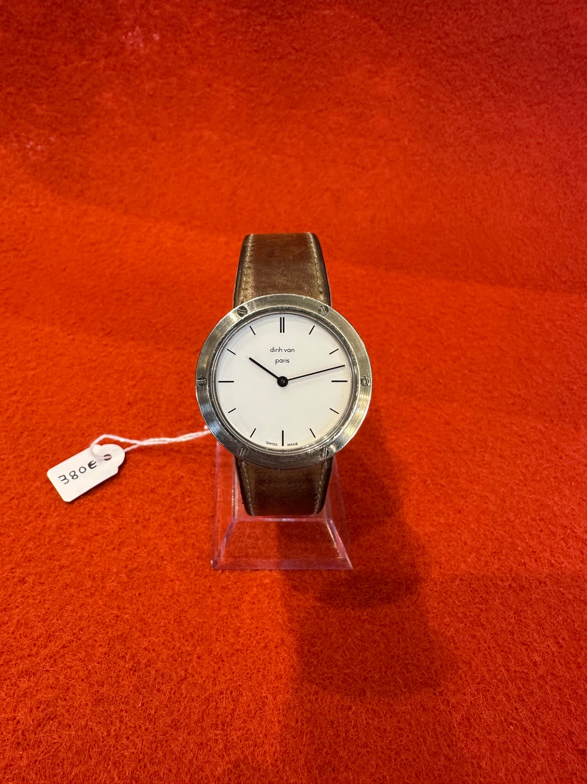 Montre dinh van Circa de 2010, avec couronne à 4h, dotée du mouvement Quartz, présentant un cadran blanc mat index noirs, logé dans un boîtier acier de 6,8 mm de diamètre, mm d’épaisseur pour un poids brut de 37,20 g, montée sur un bracelet en cuir dinh van vintage avec boucle acier.