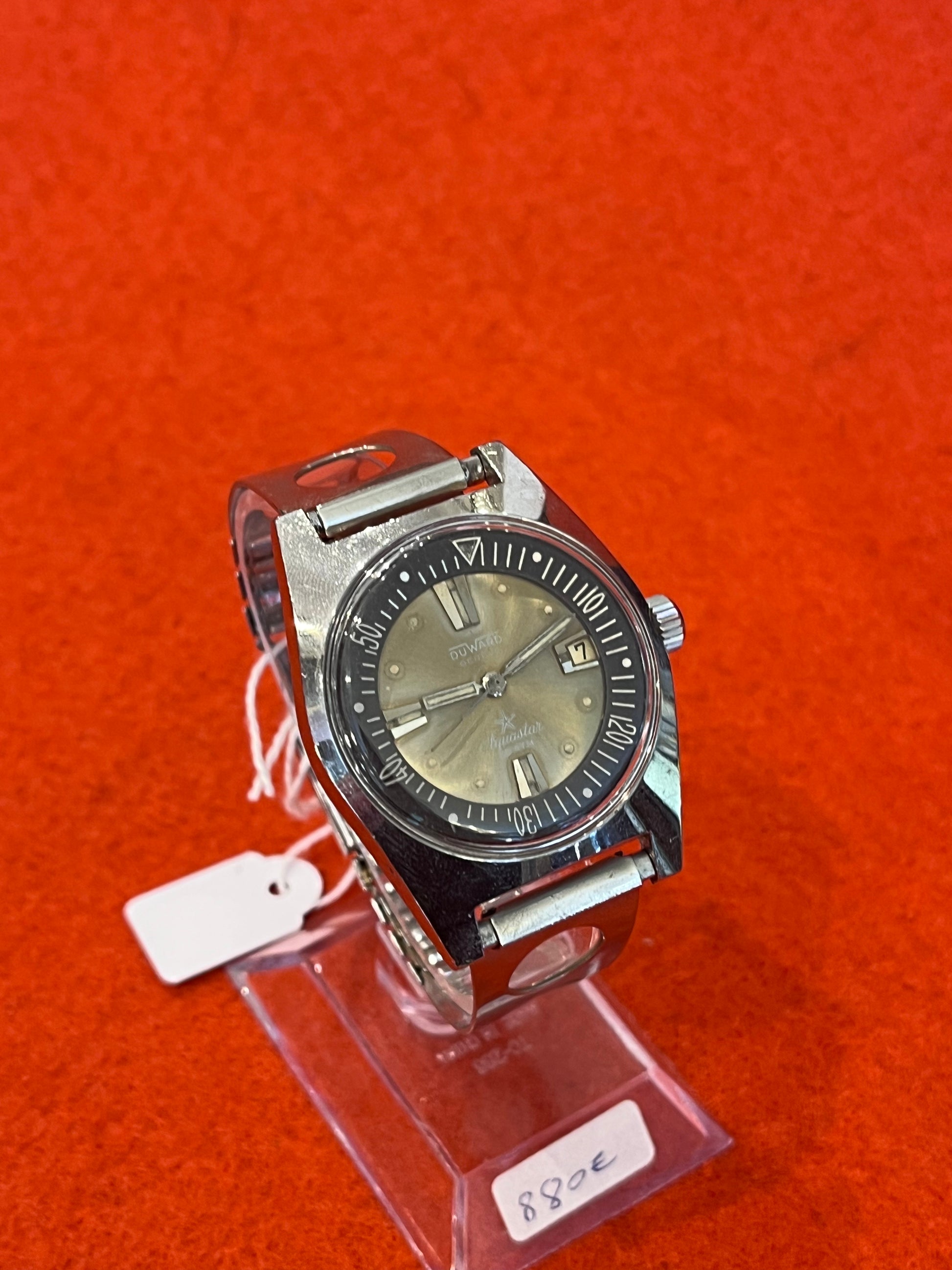 Duward automatique des années 60 avec date à 3h, équipée d'un mouvement automatique de précision, avec cadran gris champagne soleillé et lunette interne rotative graduée, boîtier acier de type plongeuse (étanche 20 ATM à l'origine) de diamètre 37 mm épaisseur 12 mm poids brut 81,45 g avec bracelet en acier style "Oyster" ajouré et une boucle déployante acier.
