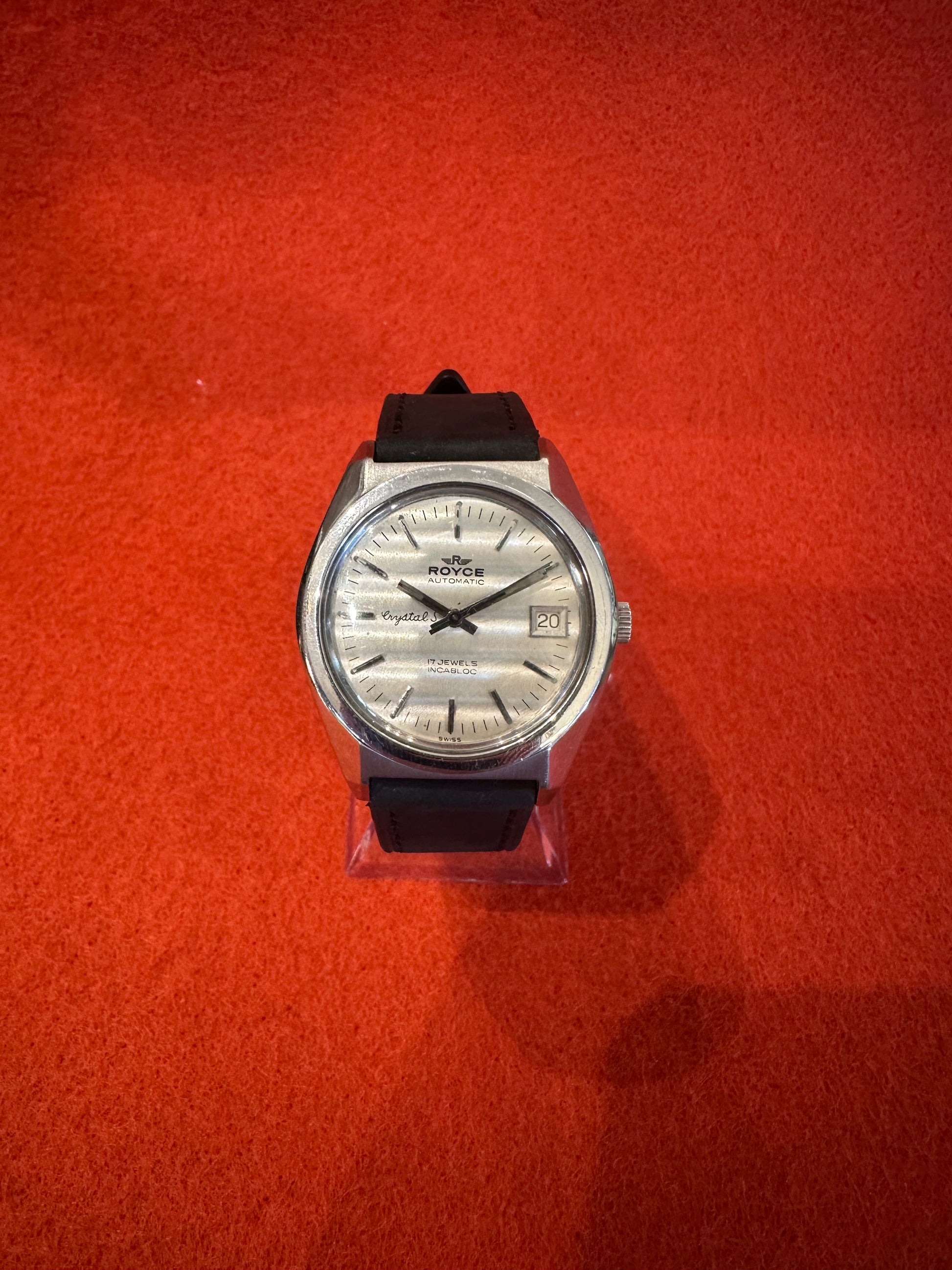 Montre Royce Crystal S automatique des années 1980, dotée d’une date à 3h et du mouvement automatique 5203, présentant un cadran blanc texturé, logé dans un boîtier acier de 36.7 mm de diamètre, 12,4 mm d’épaisseur pour un poids brut de 62,56 g, montée sur un bracelet en cuir huilé noir à motif avec boucle acier.