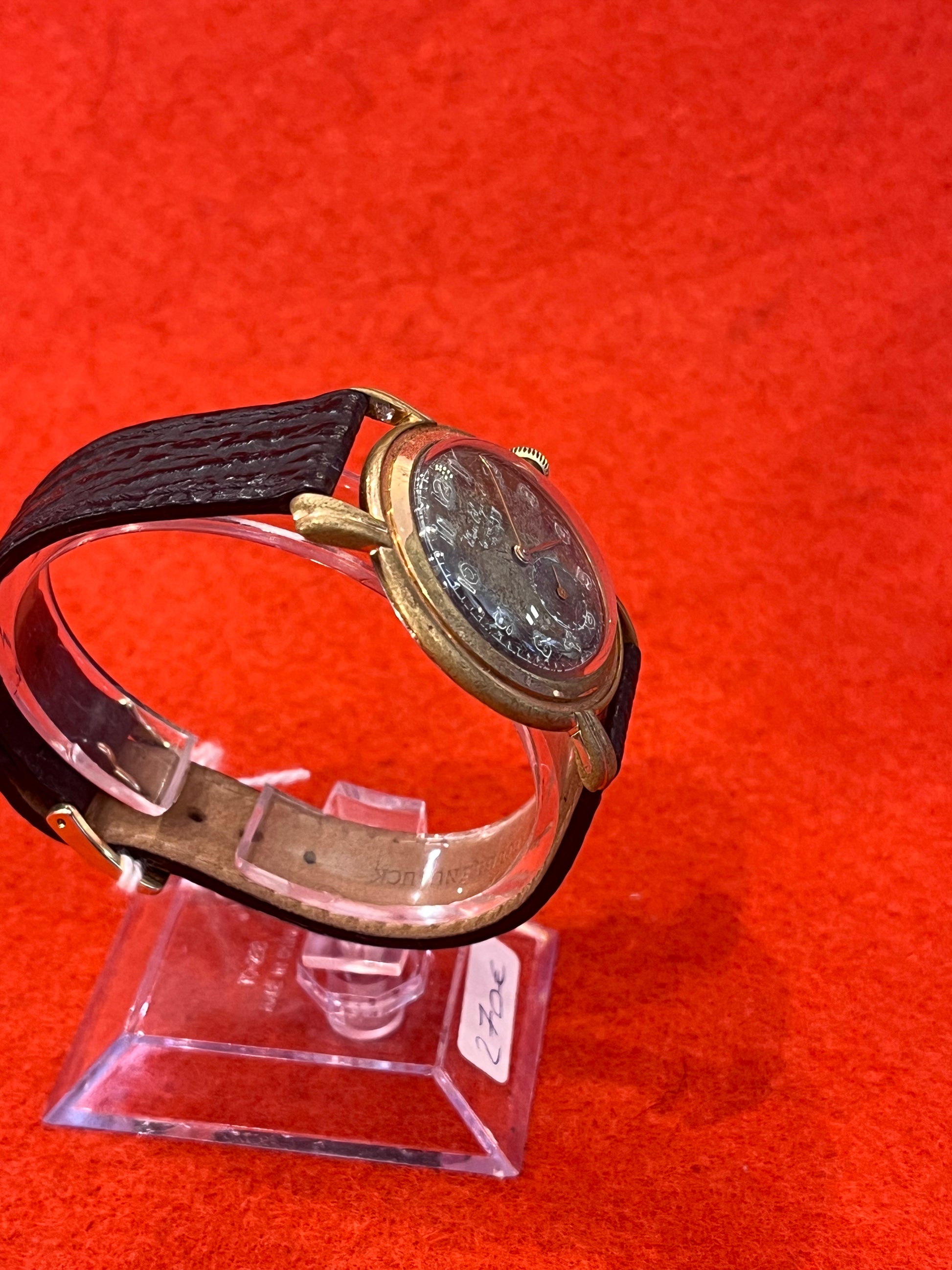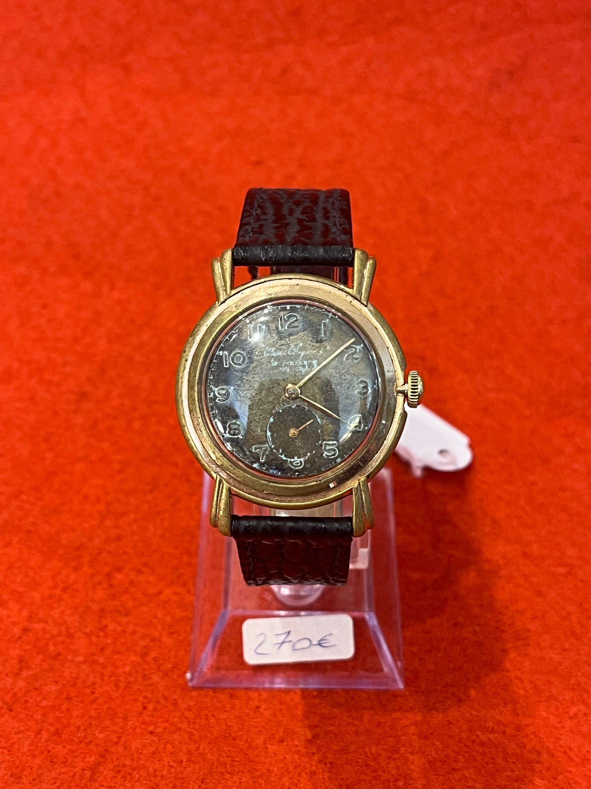Ulysse Origiant mécanique des années 50 avec petite seconde à 6h, équipée d'un mouvement mécanique à remontage manuel, avec cadran à patine "tropicale" (vieillissement naturel craquelé), boîtier doré à cornes stylisées de diamètre 35 mm épaisseur 10,9 mm poids brut 43,77 g avec bracelet en cuir noir façon lézard et une boucle dorée.